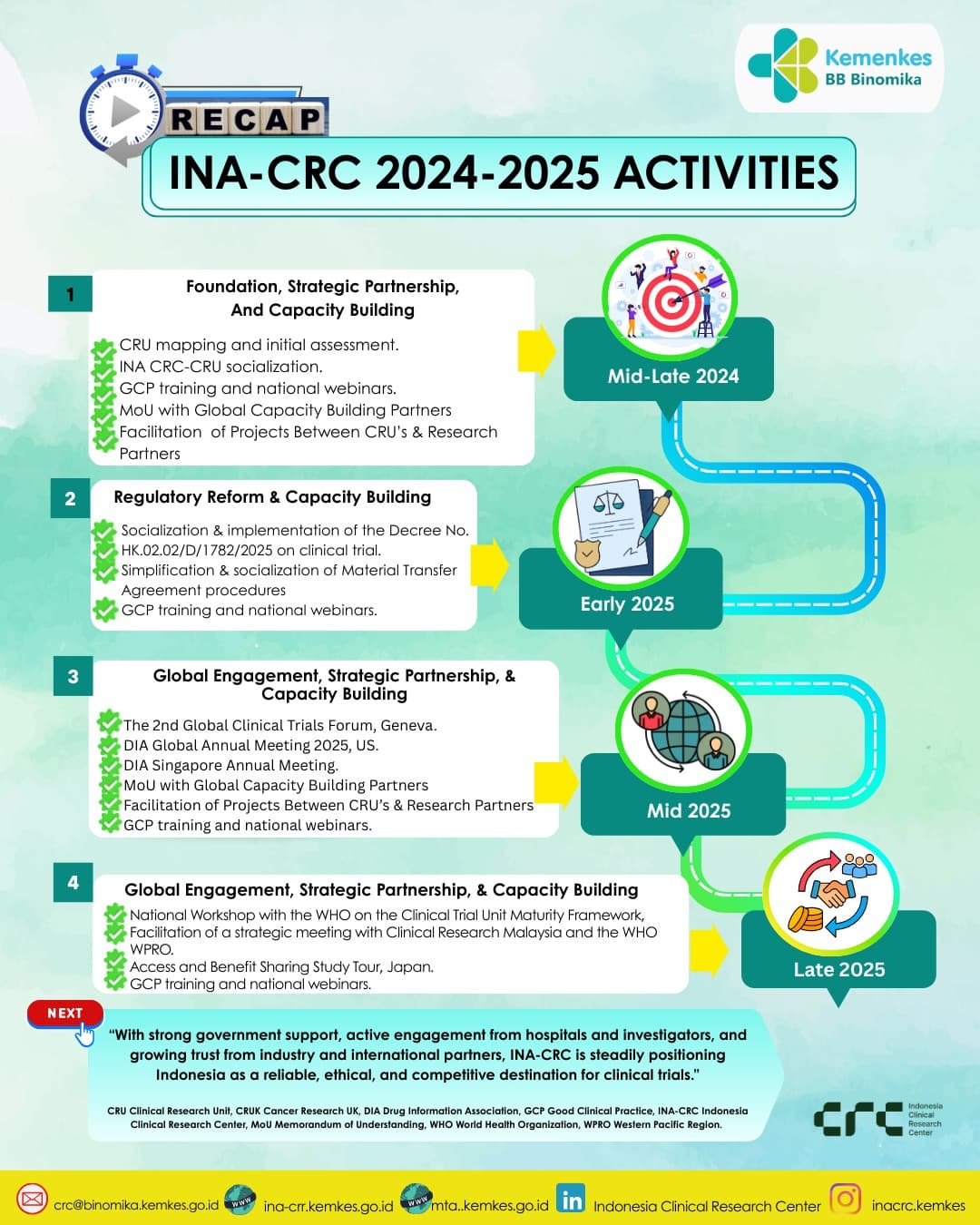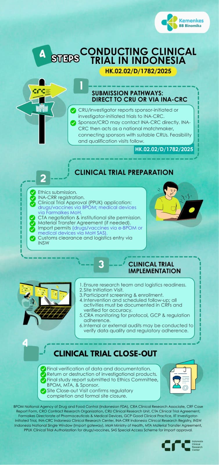 At present, only a small number of active CGT clinical trials are registered in Indonesia for 2024–2025. Most remain in early‑phase (Phase I/II) studies, focusing on stem cell‑based therapies and regenerative medicine. These trials are typically conducted in collaboration between hospitals, universities, and biotech firms, under the oversight of the Ministry of Health and BRIN. To create an environment suitable for further clinical trial development, the Indonesian government established the Indonesia Clinical Research Centre (INA‑CRC) in mid‑2024 to streamline trial processes and attract international sponsors. Since its inception, INA‑CRC has strengthened the regulatory framework for CGT, advanced capacity building, and initiated global partnerships. In late 2025, INA‑CRC, together with the WHO Indonesia Country Office and the WHO Western Pacific Regional Office (WPRO), hosted a national workshop in Jakarta. The workshop focused on strengthening Indonesia’s clinical trial ecosystem and piloting the WHO Clinical Trial Unit‑Maturity Framework (CTU‑MF), aligning with the Global Action Plan for Clinical Trial Ecosystem Strengthening. The establishment of INA‑CRC and Indonesia’s move to WPRO in 2025 mark a major step forward in clinical trial readiness, creating stronger opportunities for cell and gene therapy trials as Indonesia aligns with international standards and expands regional collaboration. Building on this foundation, Indonesia is now entering the next phase: advancing CGT research to translate these early efforts into scientific breakthroughs and clinical applications.