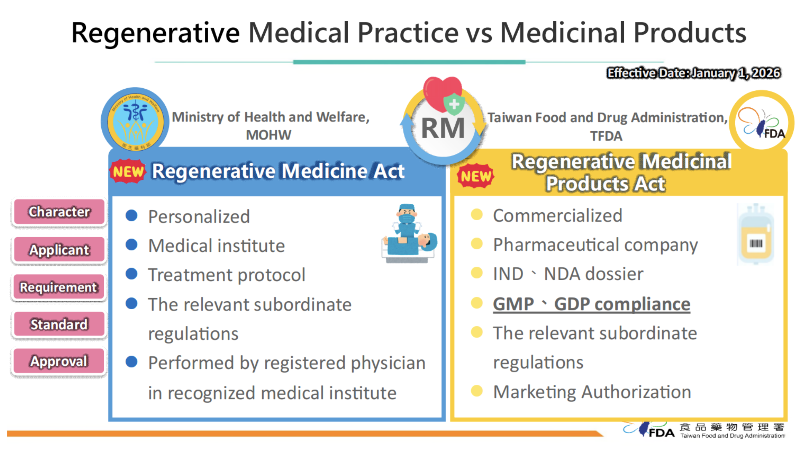 Those two special events were deemed as a turning point for the regulatory framework transformation to accelerate regenerative medicine innovation and enhance patient access. New acts for regenerative medicine were enforced on January 1st 2026. The two new acts, the “Regenerative Medicine Act” and the “Regenerative Medicinal Products Act,” are legislated based on scientific evidence. The comparison of two acts is summarized in Fig. 1.